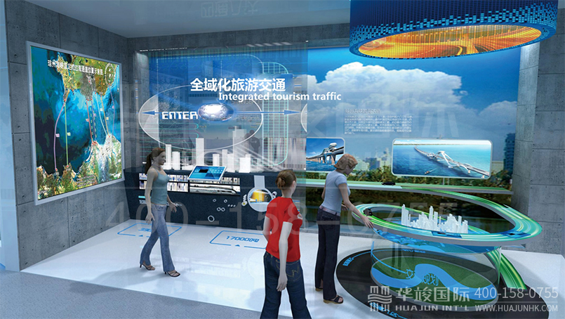 旅游業——全域旅游交通,以海口當前重點規劃的美蘭機場、高速公路、跨海大橋等為核心。一方面通過實體模型反映城市交通的立體格局,另一方面結合顯示大屏,全面體現海口交通的便捷,為全域旅游奠定基礎。
