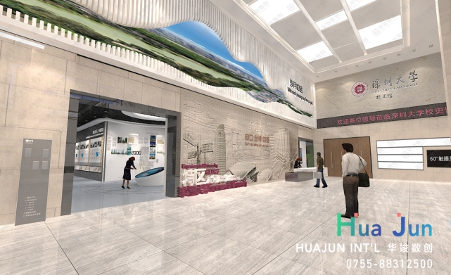 以華竣數(shù)創(chuàng)設(shè)計過的某大學(xué)校史館為例,其展廳通過時間軸的布局,將學(xué)校的發(fā)展歷程分為幾個重要階段,每個階段通過圖片、文獻、實物及互動展項進行展示。特別是利用AR技術(shù),觀者可以通過手機或平板電腦,看到歷史照片中的場景在現(xiàn)實中的立體顯現(xiàn),極大地增強了參觀的沉浸感和互動性。