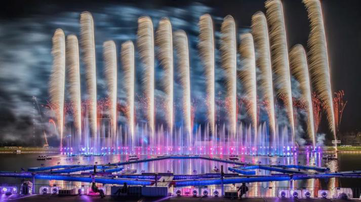 9月19日,人們?cè)谒帧捌婊脽艄夤?jié)”上觀賞聲光噴泉。在華竣國(guó)際打造的超1000項(xiàng)展館案例中,這一技術(shù)也曾多次運(yùn)用。